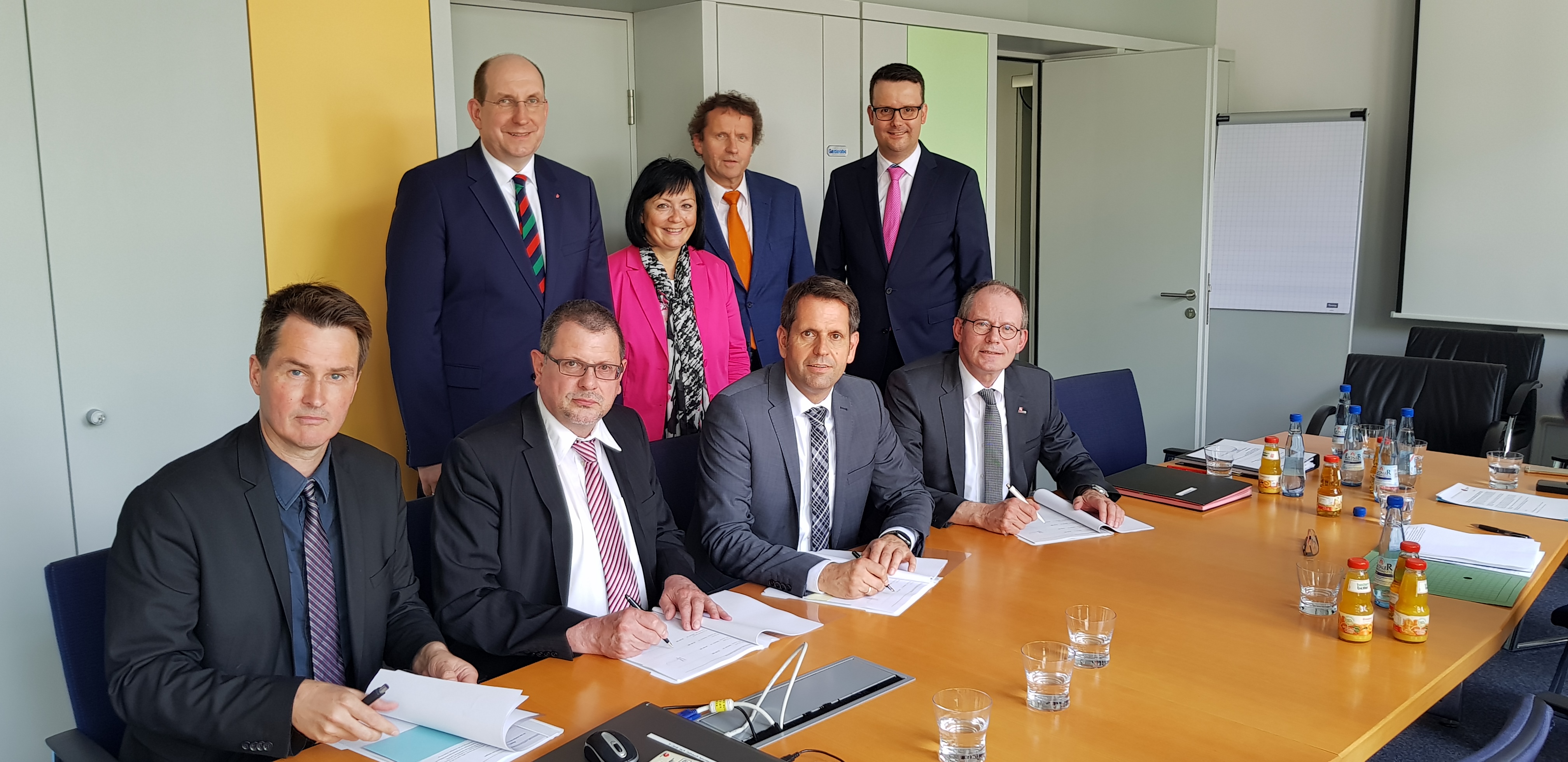 Auf dem Bild v.l. sitzend: Michael Frömming, Christian Gabriel, Minister Olaf Lies, Hans-Joachim Menn; stehend dahinter v.l.: Matthias Wunderling-Weilbier, Astrid Klinkert-Kittel, Uwe Schwarz, Christian Grascha