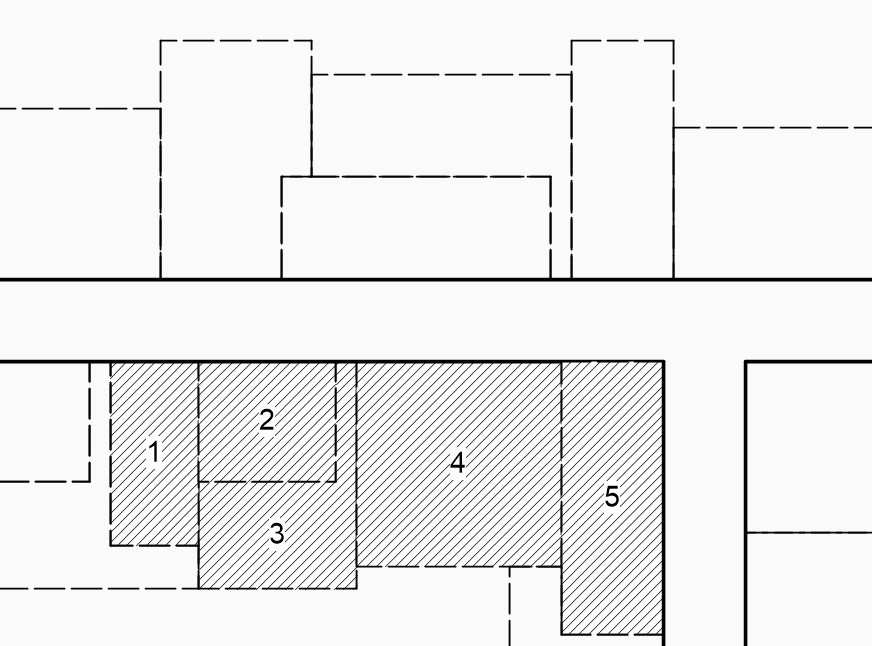 Mit einer Kombination der Verteilungsmaßstäbe 2 (Grundstücksfläche) und 3 (Grundstückslänge an der Erschließungsanlage) kann einer fairen Verteilung angesichts heterogener Grundstücke in Bezug auf Größe und Lage im NQG-Quartier Rechnung getragen werden, wie es oft in gewachsenen Altstadt- oder Dorfkernstrukturen der Fall ist. Hierfür muss festgelegt werden, in welchem Verhältnis die Verteilungsmaßstäbe verbunden werden. Im folgenden Beispiel hat die Quartiersgemeinschaft einen Gesamtmittelbedarf von 100.000 €, welche über fünf Jahre verteilt von 60 Eigentümerinnen und Eigentümern aufgebracht werden sollen. Die Abgabe setzt sich zu 50 % aus Verteilungsmaßstab „Grundstücksfläche“ und zu 50 % aus Verteilungsmaßstab „Grundstückslänge an der Erschließungsanlage“ zusammen. Bei einem Grundstück (1) mit einer Fläche von 350 m2 und 13 m Länge an der Straßenseite ergibt sich beispielsweise ein Gesamtbetrag von 2.680 €, was für die Eigentümerin oder den Eigentümer eine jährliche Abgabe von 536 € bedeutet. Für ein Grundstück (2) mit ebenfalls 350 m2 Fläche und 20 m Straßenlänge werden 651 € jährlich fällig. Bei einem Grundstück (3) in zweiter Reihe mit 300 m2 aber nur 3 m Straßenseitenlänge beträgt die jährliche Abgabe 337 €. Bei einem Grundstück (4) mit 900 m2 mit 30 m Straßenlänge sind in dem Beispiel für die Eigentümerin oder den Eigentümer 1.162 € jährlich zu leisten.