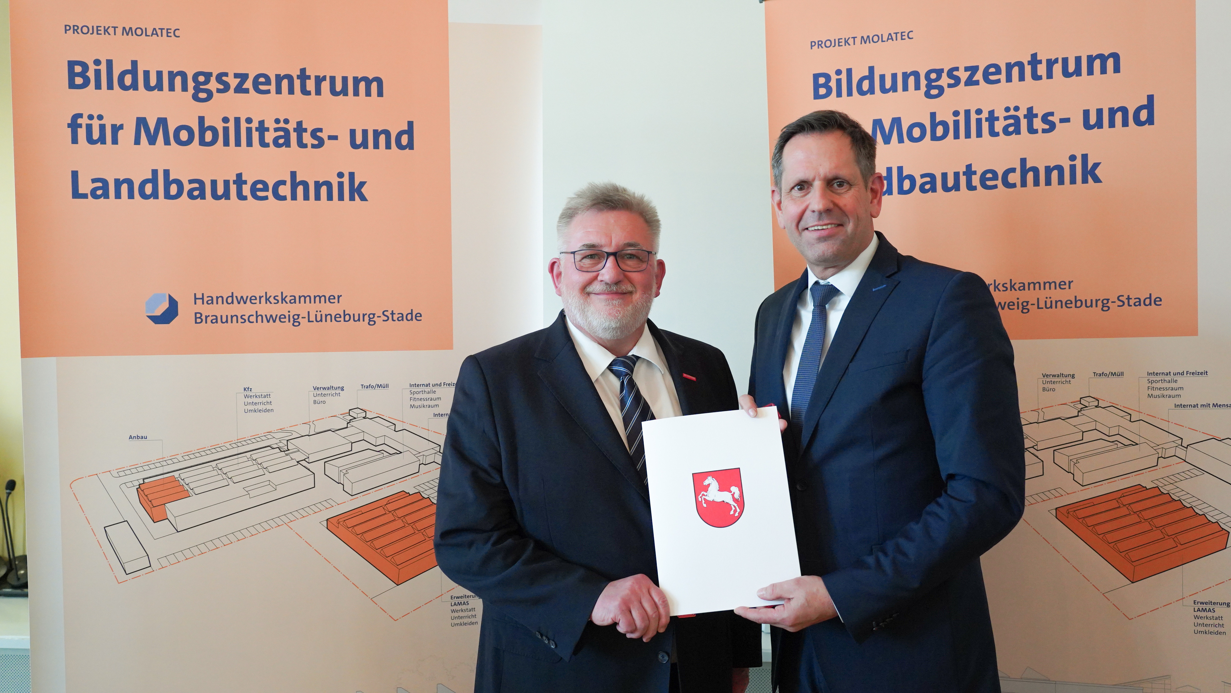 Dafür hat Wirtschaftsminister Olaf Lies heute Detlef Bade, Präsident der Handwerkskammer, einen Förderbescheid in Höhe von 13,5 Millionen Euro überreicht.