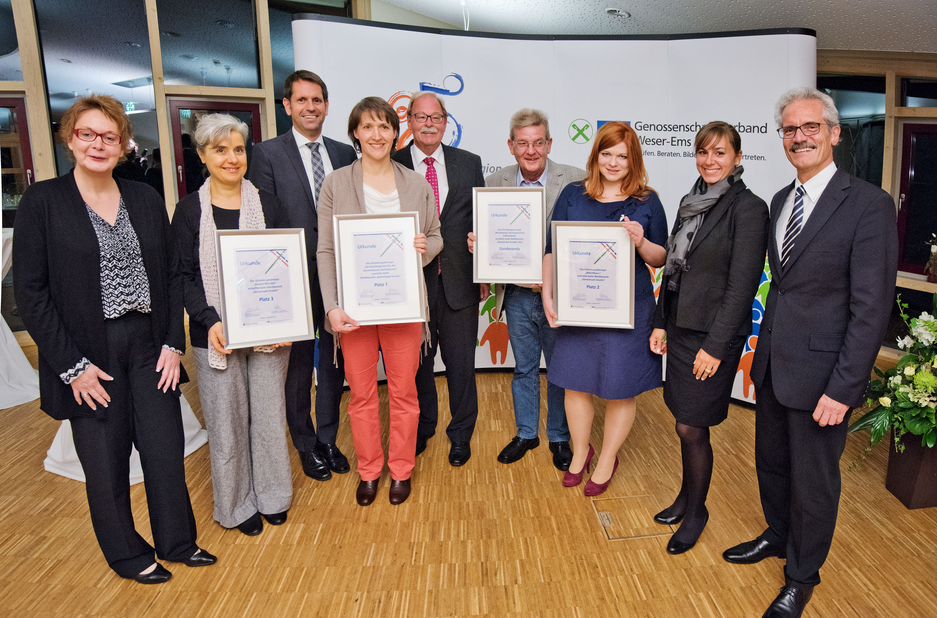 Wirtschaftsminister Olaf Lies hat heute in Rastede die Gewinnerinnen und Gewinner des neu initiierten Ideen-Wettbewerbs „Eins, zwei, drei – WIR! Gemeinsam kreativ“ ausgezeichnet. Gewürdigt wurden neue genossenschaftliche Unternehmenskonzepte. Der erste Preis ging an das Projekt „Küchengarten für alle Generationen und Kulturen“ aus Westerstede. Platz zwei ging an die Idee „MACH!bar“ aus Berne. Das Projekt „Station Mondial“ aus Großenkneten erhielt den dritten Platz. Der Sonderpreis ging an die Emder Projektidee „Bestattungs-Genossenschaft-Ostfriesland“.