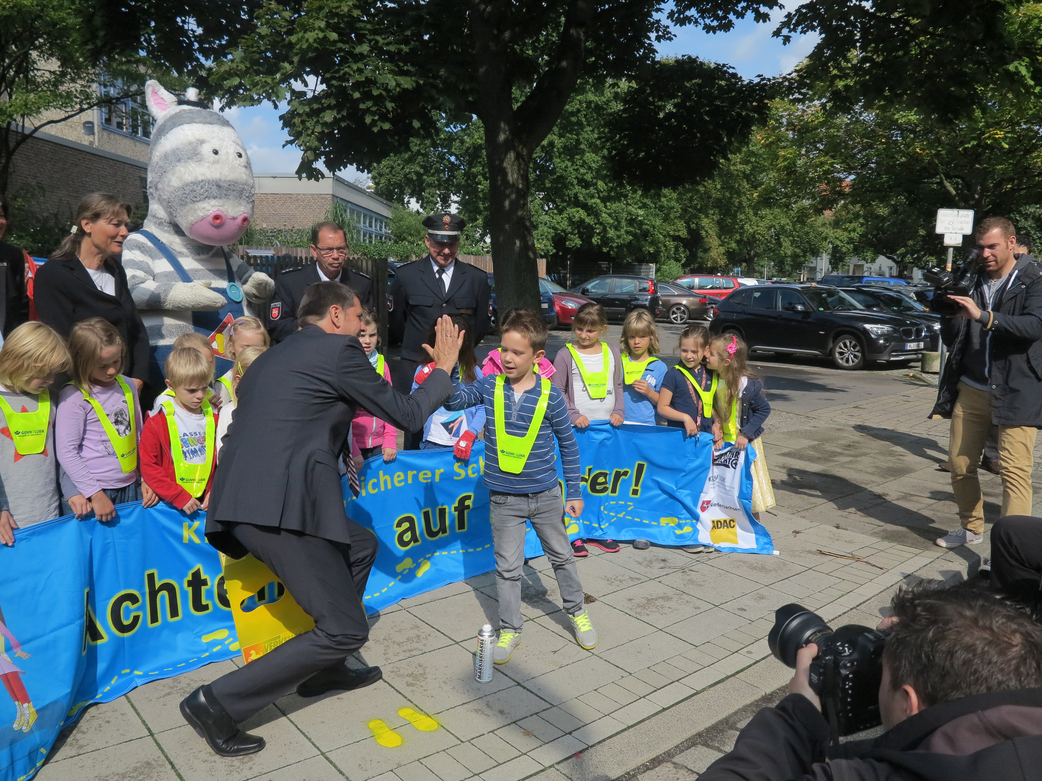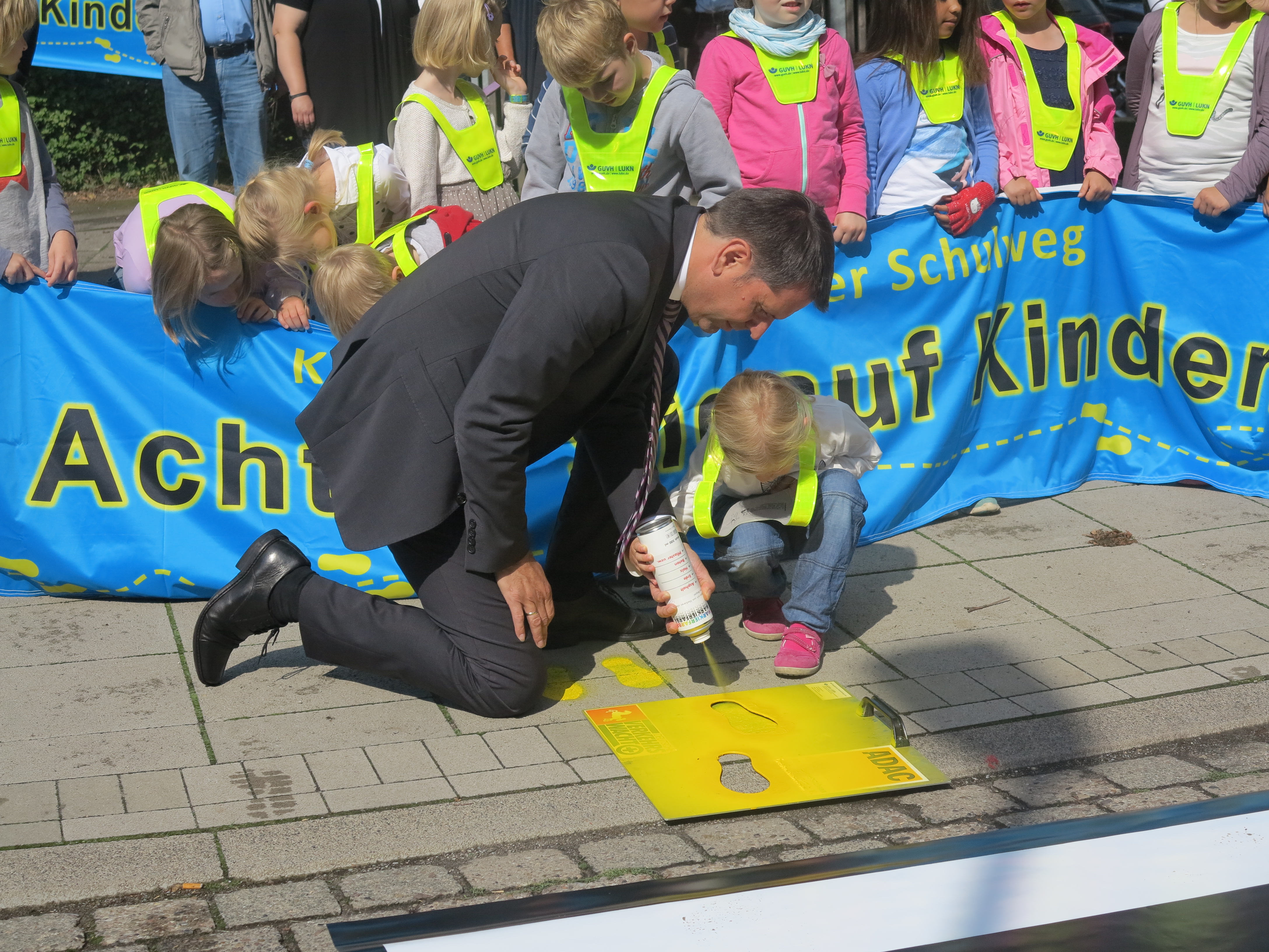 Vor der Grundschule Suthwiesenstraße in Hannover sprühte der Minister zusammen mit Schülern und Lehrern ein Paar der „Kleinen gelben Füße“ auf den Boden, die schon seit Jahren fester Bestandteil der Aktion „Kleine Füße – sicherer Schulweg“ sind. Sie werden an Stellen auf den Boden gesprüht, die sich besonders gut zum Überqueren einer Straße eignen.