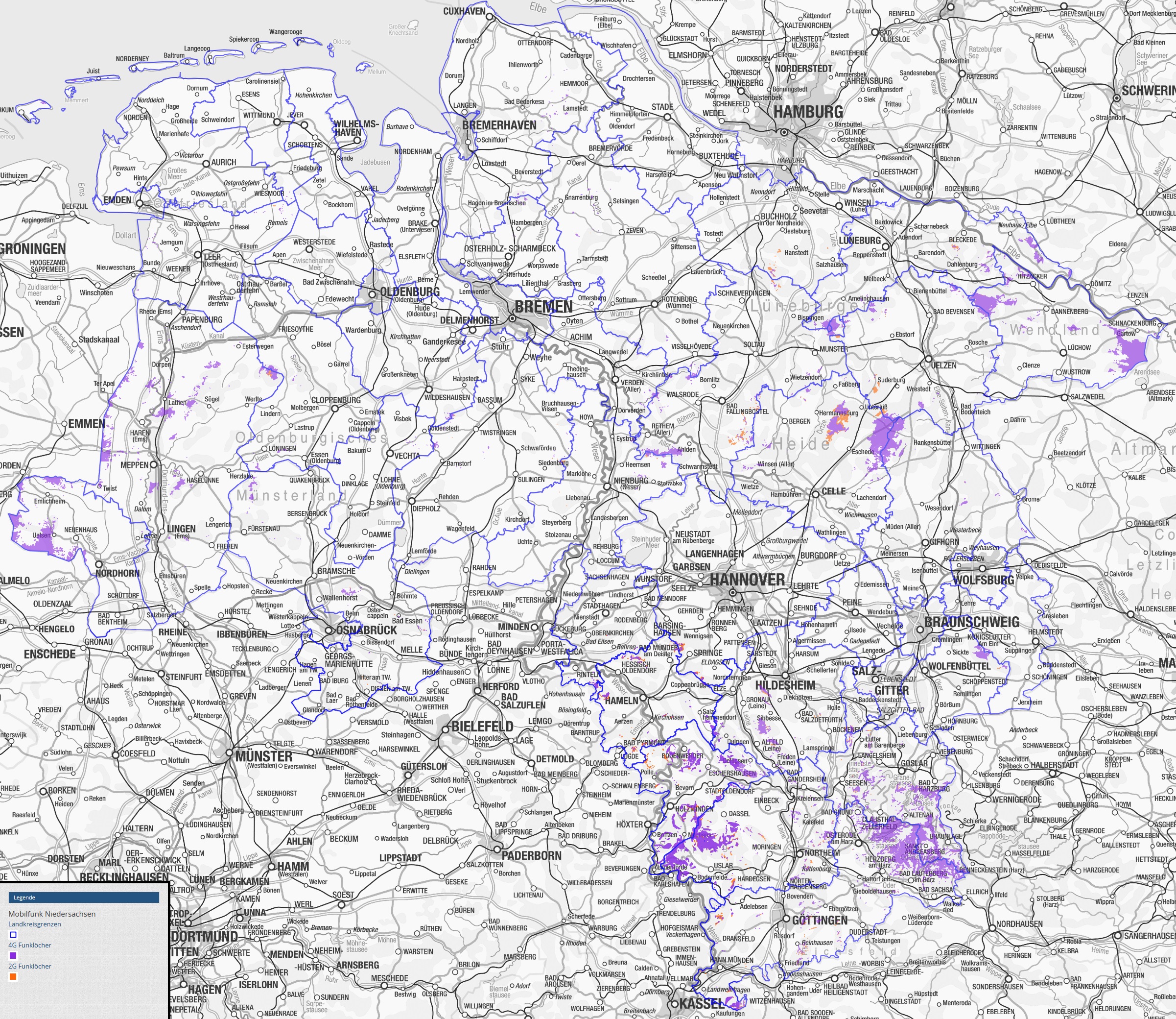 https://www.niedersachsen-breitbandatlas.de/mapbender3/application/Mobilfunkatlas_NiedersachsenDer Mobilfunkatlas soll Landkreisen und Kommunen als Informationsquelle dienen und legt die Lücken in der Mobilfunkversorgung offen, in denen kein Netzbetreiber aktiv ist.
