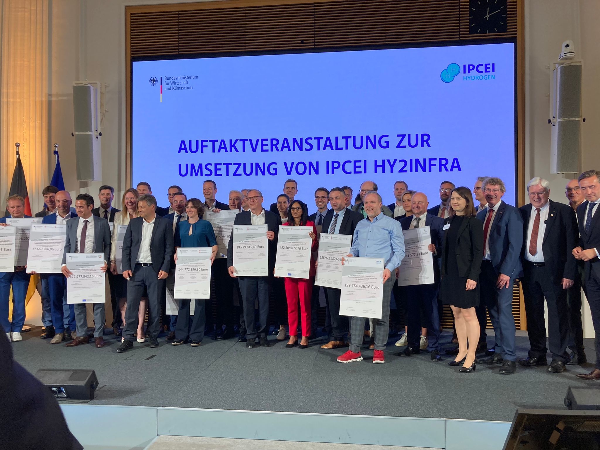 Zusammen mit Bundeswirtschaftsminister Robert Habeck übergaben Niedersachsens Energieminister Christian Meyer und Staatssekretär Frank Doods aus dem niedersächsischen Wirtschaftsministerium heute die gemeinsame Bund-Länder-Förderung für zehn niedersächsische „IPCEI“-Projekte in Berlin – im Umfang von insgesamt 1,28 Milliarden Euro. Bei den geförderten Projekten geht es sowohl um die großtechnische Erzeugung von grünem Wasserstoff, als auch um Leitungsvorhaben zum Transport sowie um den Aufbau von Speicherkapazitäten.