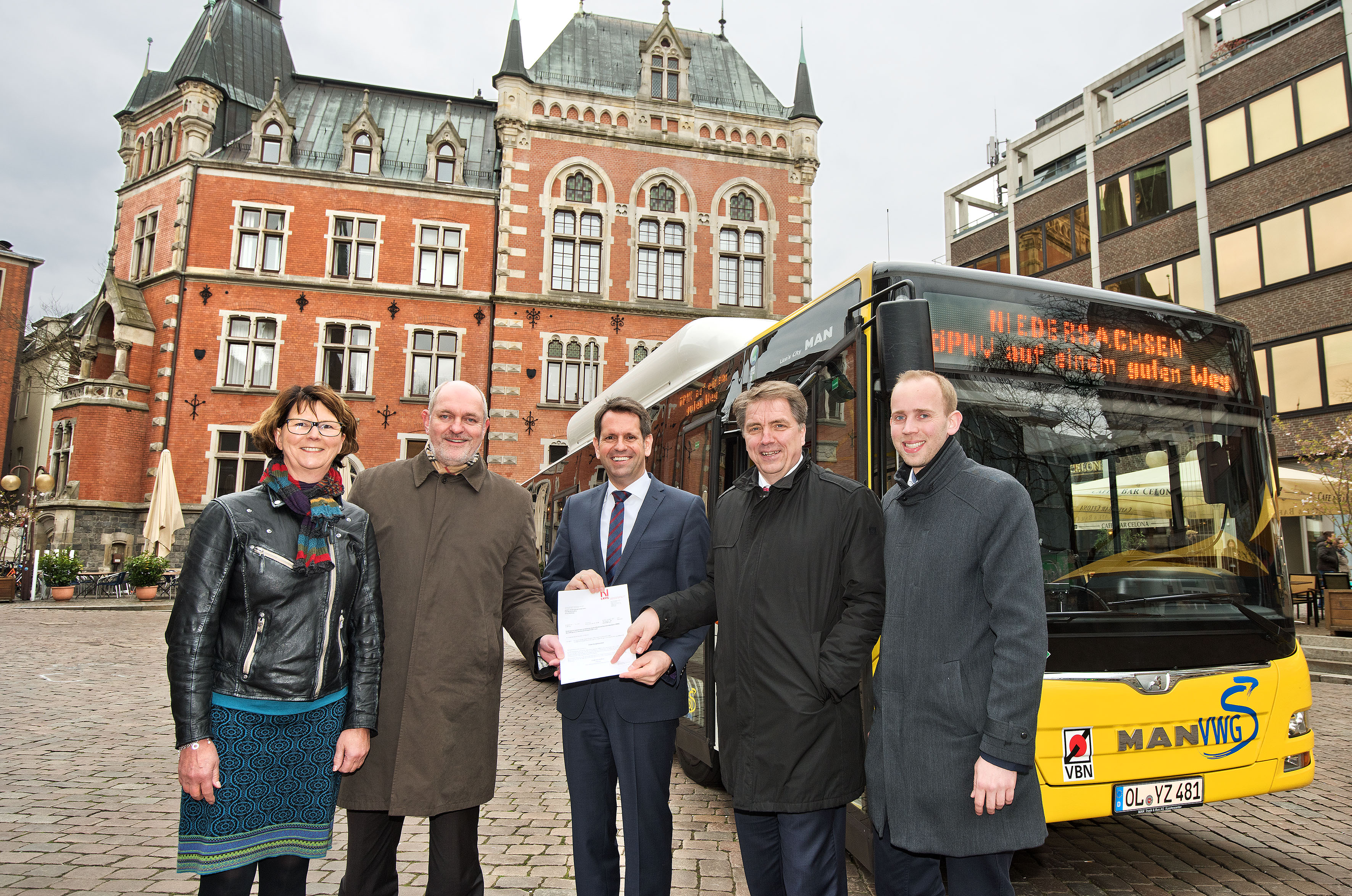 Übergabe des Förderbescheids durch den Verkehrsminister, v.l.: MdL Susanne Menge, Geschäftsfüher der VWG Michael Emschermann, Minister Olaf Lies, Oberbürgermeister Jürgen Krogmann und MdB Dennis Rohde, Foto: Thorsten Ritzmann