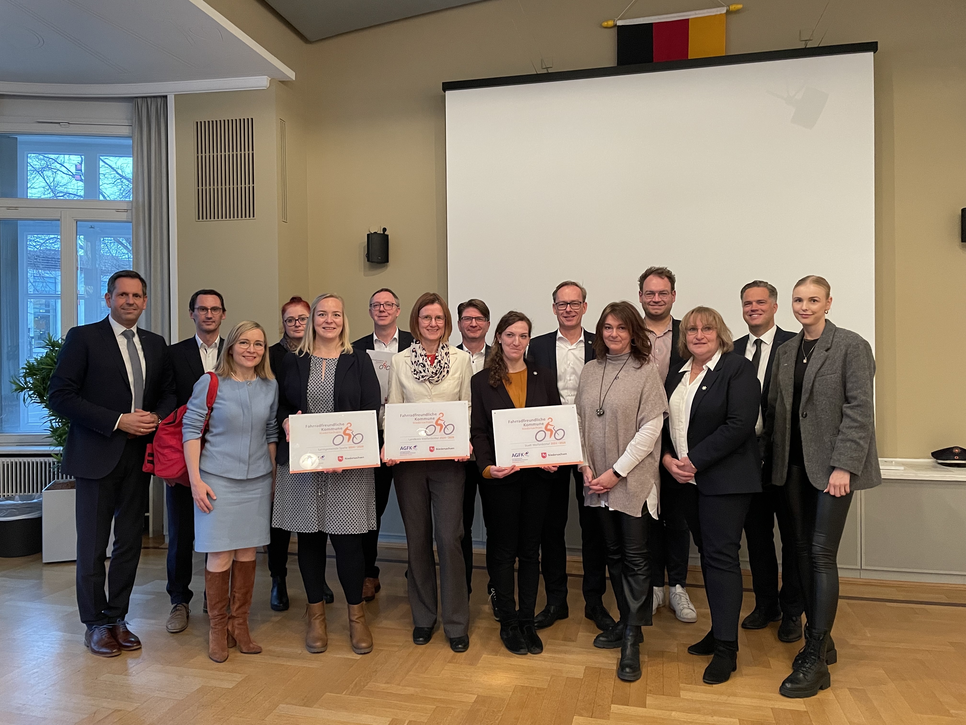 Niedersachsens Verkehrsminister Olaf Lies hat heute drei Kommunen für ihre herausragenden Bemühungen im Bereich der Fahrradmobilität ausgezeichnet: Sie erhielten das Zertifikat „Fahrradfreundliche Kommune“. Die Stadt und der Landkreis Wolfenbüttel beantragten erfolgreich eine Rezertifizierung, um ihre bereits vor fünf Jahren erworbenen Zertifikate zu erneuern. Die Samtgemeinde Spelle hat sich erstmals um das Zertifikat beworben und erhält ebenfalls bis einschließlich 2028 den Titel „Fahrradfreundliche Kommune.“