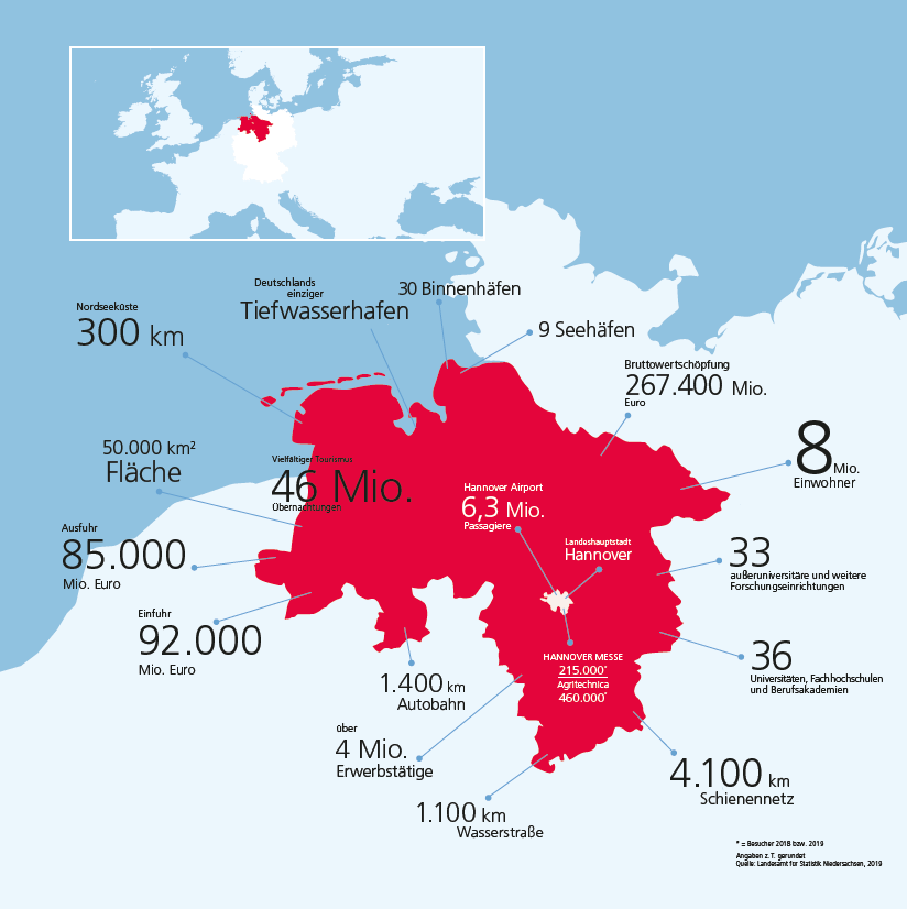 Niedersachsen ist flächenmäßig das zweitgrößte und mit rund 8 Millionen Einwohnern der Bevölkerungszahl nach das viertgrößte Bundesland Deutschlands. Es zeichnet sich durch seine zentrale Lage in der Mitte Europas aus. Die Autobahnverbindungen reichen auf der Nord-Süd-Achse von Skandinavien bis Italien, auf der West-Ost-Achse von Amsterdam/Paris/London über Berlin und Warschau bis nach Moskau. Die niedersächsischen Seehäfen sind das Tor nach Amerika, Fernost und zum Rest der Welt. Der Einstieg Niedersachsens in den internationalen Überseecontainerumschlag ist durch den Tiefwasserhafens JadeWeserPort sichergestellt, der im Jahr 2012 seinen Betrieb aufgenommen hat. Über das rund 1.700 km lange Wasserstraßennetz in Niedersachsen werden die Seehafen- und Binnenhafenstandorte mit dem westdeutschen Kanalnetz und über den Mittellandkanal die westeuropäischen mit den osteuropäischen Binnenwasserstraßen verbunden. Das Schienennetz in Niedersachsen umfasst mehrere Tausend Kilometer. Es ist Rückgrat für die Mobilität im Personenverkehr und eine wichtige Anbindung an die Häfen. In Niedersachsen bieten Güterverkehrszentren, weitere Terminals für den Kombinierten Verkehr und Gleisanschlüsse umfangreiche Zugangsmöglichkeiten zum Schienenverkehr für die Logistik. Im Juni 2021 wurde in Lehrte in der Region Hannover einer der modernsten Güterbahnhöfe Europas, der MegaHub, eröffnet. Als erste Anlage ihrer Art in Deutschland beschleunigt der MegaHub Lehrte mit zahlreichen Innovationen den voll digitalisierten Umschlag von Ladeeinheiten. Diese effiziente Arbeitsweise spart Zeit und Energie gegenüber dem Rangieren der Wagen und senkt zudem die Lärmbelastung. In Sachen Flugverkehr Richtung Osten nimmt der HannoverAirport in Deutschland eine führende Stellung ein. Mehr als 100 Ziele in Osteuropa und Zentralasien werden von hier aus direkt und über Hubs bedient.